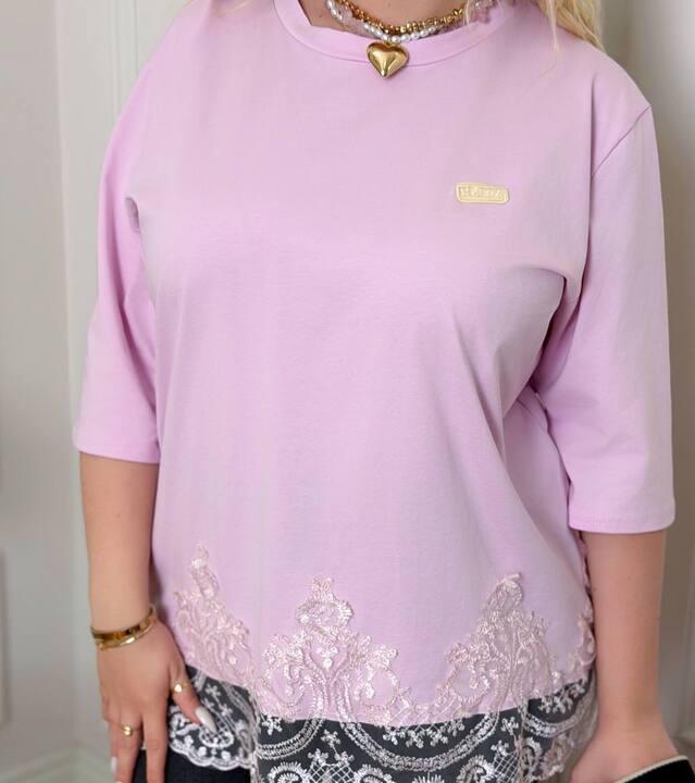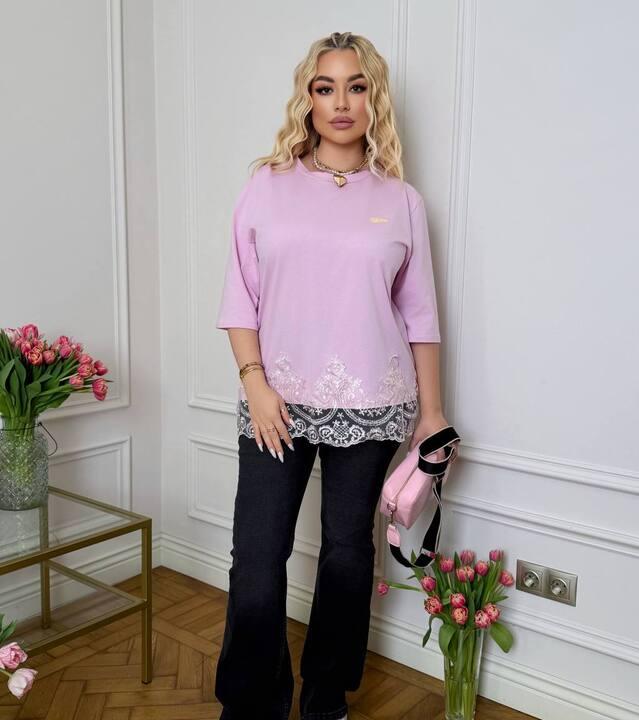 Футболка выполнена в стиле over, поэтому посадка смотрится расслабленно, модно и очень актуально. Круглый вырез делает модель универсальной и удобной для ежедневной носки. Рукав комфортной длины добавляет практичности, а кружевная отделка по нижнему краю делает изделие более женственным, заметным и эффектным. Именно эта деталь придаёт футболке особое настроение: она выглядит не как обычная базовая вещь, а как продуманная стильная модель с акцентом на красивую подачу.