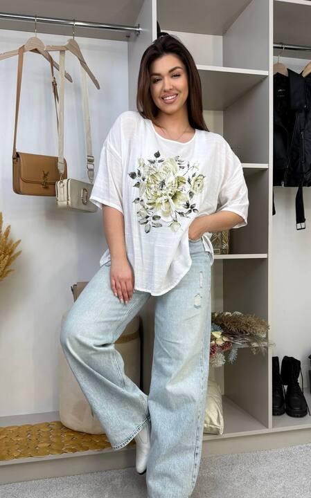 Декоративный цветочный рисунок на передней части делает футболку-тунику более выразительной и добавляет образу заметный стильный акцент. Круглый вырез сохраняет универсальность и делает модель удобной для ежедневной носки. Рукав 3/4 с возможностью фиксации добавляет практичности и позволяет менять подачу образа в зависимости от настроения и сочетаний. За счёт такого фасона модель легко комбинируется с джинсами, брюками, лосинами и другим повседневным низом, создавая гармоничные и удобные образы.