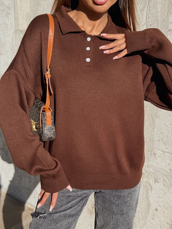 Главная особенность модели – воротник-поло с планкой на пуговицах, который придаёт свитеру нотку элегантности и делает его универсальным. Такая деталь позволяет легко комбинировать его как с повседневными образами, так и с более нарядными комплектами.