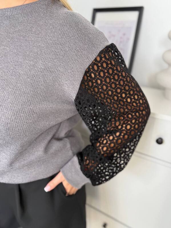 Свитер женский осенне-зимний ангора с контрастными ажурными рукавами серый k-124670