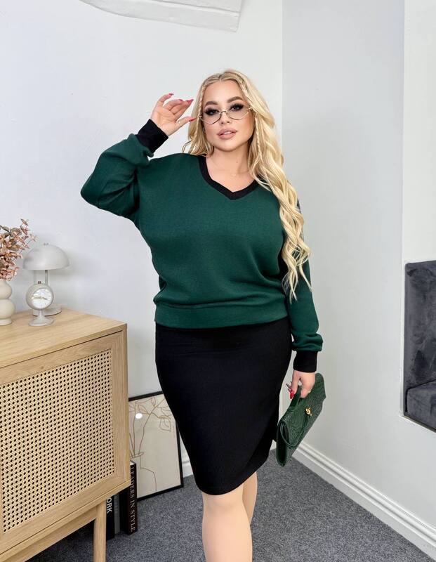 Комбинация контрастных оттенков выглядит стильно и элегантно, а лаконичный дизайн делает комплект универсальным вариантом для любого случая. Платье подчёркивает женственность силуэта, а свободная кофта с V-образным вырезом добавляет образу лёгкости и утончённости.