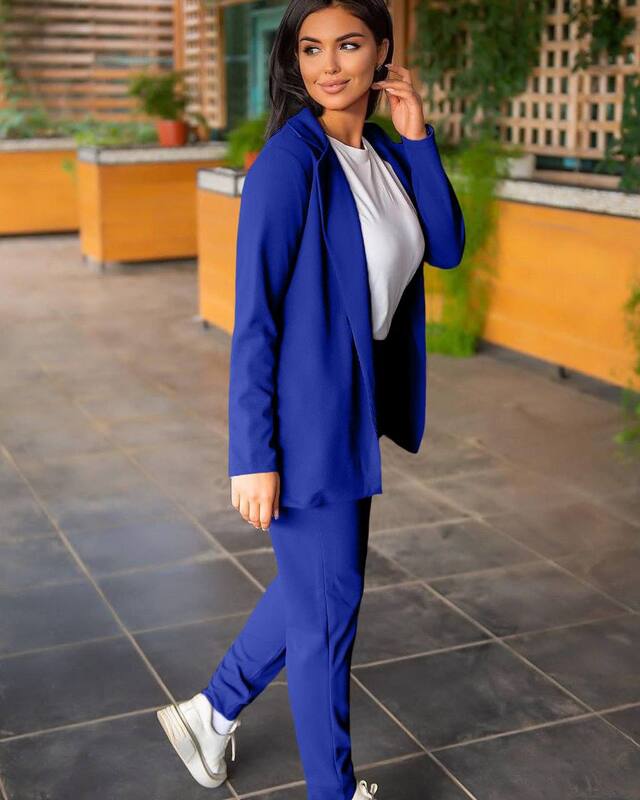 Жакет свободного силуэта с классическим лацканом создаёт элегантный акцент и легко заменяет верхнюю накидку в прохладное время. Брюки на резинке с регулирующим шнурком обеспечивают комфорт и практичность, а боковые карманы добавляют функциональности. Прямой крой брюк визуально вытягивает силуэт и подчеркивает изящество фигуры.