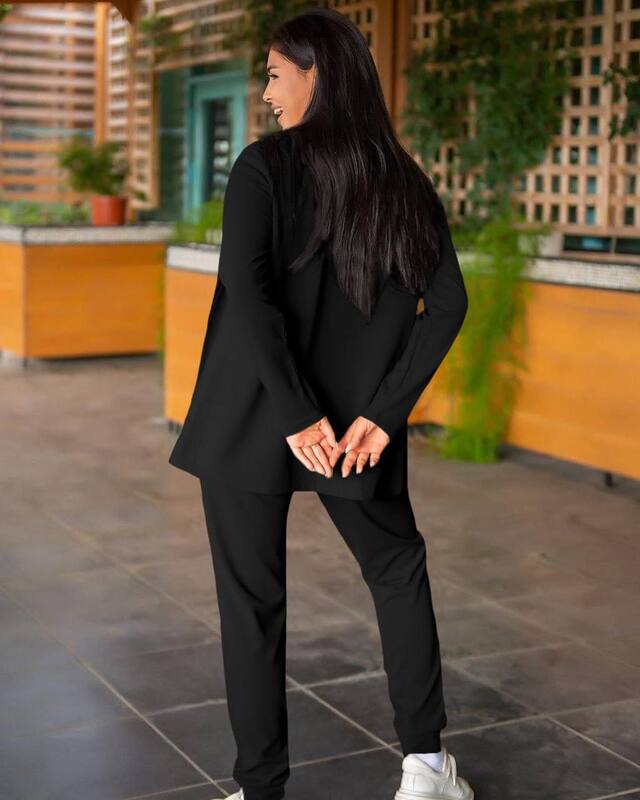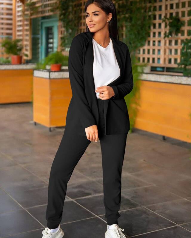 Жакет свободного кроя с классическим лацканом создаёт элегантный силуэт, а отсутствие застежек придает образу лёгкость и расслабленность. Брюки на резинке с регулирующим шнурком и боковыми карманами обеспечивают комфорт и практичность, при этом благодаря прямому крою они визуально вытягивают силуэт, делая фигуру стройнее.