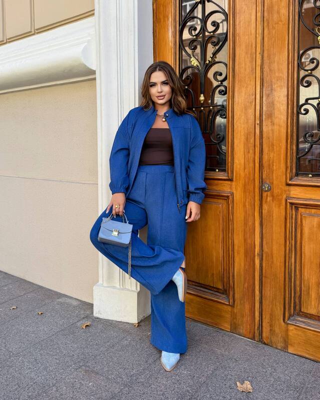 Модель идеально подходит для осеннего сезона: в таком костюме комфортно как в дневное время для прогулок или встреч, так и в вечернем образе, если дополнить аксессуарами. Стильный оттенок электрик добавляет свежести и яркости, позволяя выделяться, оставаясь в тренде.