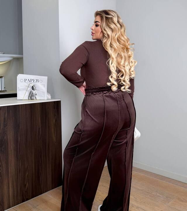 Лонгслив выполнен из евро рубчика — это материал, который выглядит фактурно, аккуратно и современно. За счёт хорошей эластичности ткань комфортно садится по фигуре, не сковывает движения и помогает изделию красиво облегать силуэт без лишнего давления. Такая фактура делает верх не просто базовым, а более выразительным и стильным. Брюки выполнены из велюра люкс качества, поэтому они смотрятся мягко, благородно и добавляют комплекту ощущение уюта. Сочетание рубчика и велюра делает костюм визуально интереснее, придаёт ему глубину и позволяет выглядеть не банально, а действительно продуманно и актуально.
