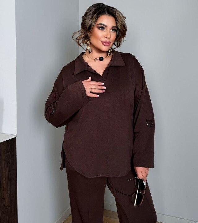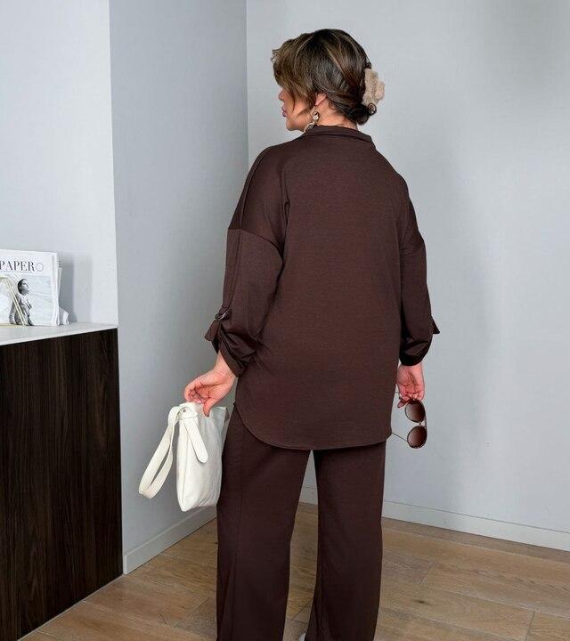 Материал двунитка делает комплект особенно удобным для повседневной носки. Ткань приятна к телу, достаточно плотная, хорошо держит форму и при этом остаётся комфортной в движении. Благодаря этому костюм выглядит аккуратно в течение дня и подходит для активного ритма жизни. Верх свободно садится по фигуре, не сковывает движения и создаёт ощущение расслабленного комфорта, а брюки прямого кроя выглядят универсально и современно. Такое сочетание особенно хорошо подходит женщинам, которые ценят удобство, но не хотят жертвовать аккуратным и стильным внешним видом.