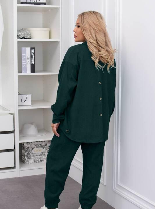 Верх выполнен в формате свободной рубашки-жакета на пуговицах с классическим воротником и длинным рукавом. Такая модель смотрится особенно выигрышно благодаря расслабленному крою, который не сковывает движения и мягко ложится по фигуре. Рубашку можно носить как самостоятельный верх или как легкий второй слой поверх майки, топа, футболки либо водолазки. Это делает комплект еще более универсальным, ведь верх легко комбинируется отдельно с джинсами, базовыми брюками и даже леггинсами. Накладные карманы добавляют практичности и подчеркивают актуальный стиль модели, а аккуратная застежка на пуговицы делает образ более завершенным.