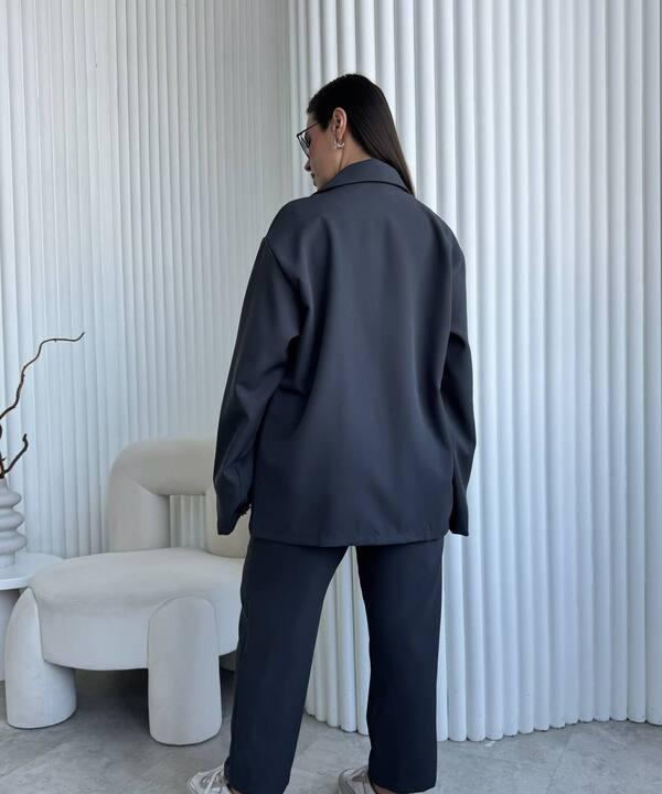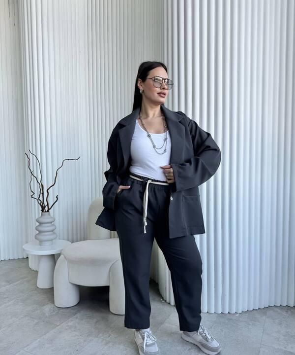 В комплект входит свободный пиджак и брюки прямого кроя. Пиджак выполнен в расслабленном силуэте, красиво сидит по фигуре, не сковывает движения и подходит для разных типов телосложения. Классический лацкан делает модель более выразительной и добавляет образу деловой нотки, а мягкая посадка позволяет носить такой верх не только как часть костюма, но и отдельно с другими вещами из гардероба. Декоративный пояс-шнур визуально подчёркивает талию, делает образ более собранным и добавляет интересный акцент без перегруженности.