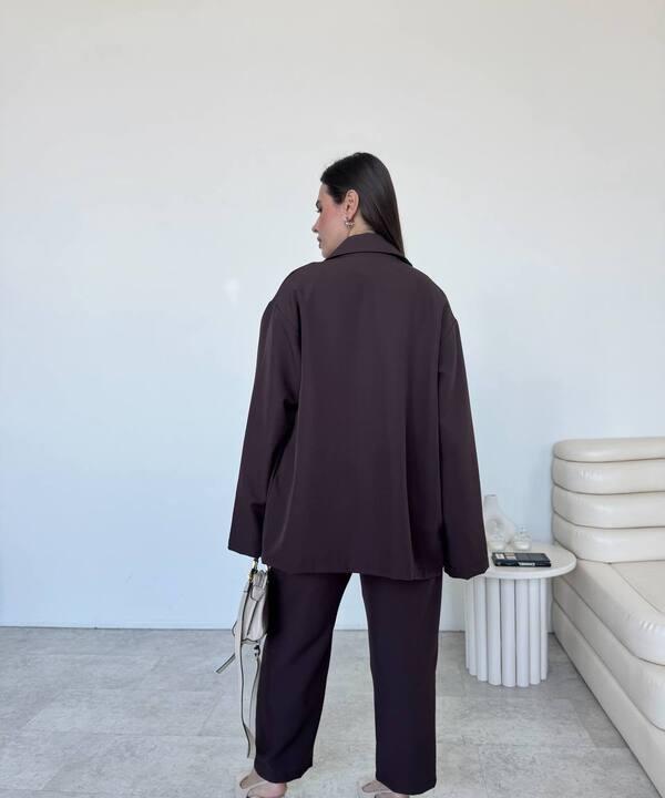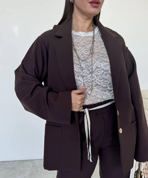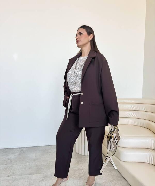 В комплект входит свободный пиджак и брюки, которые вместе создают гармоничный, современный и визуально вытянутый силуэт. Пиджак выполнен в актуальном расслабленном крое, красиво сидит по фигуре, не сковывает движения и подходит для разных типов телосложения. Классический ворот с лацканами делает образ более статусным и собранным, а декоративный пояс-шнур выгодно подчёркивает линию талии и добавляет модели выразительности. Застёжка на пуговицы смотрится лаконично и завершённо, благодаря чему костюм выглядит аккуратно и уместно как в более спокойных, так и в более нарядных сочетаниях.