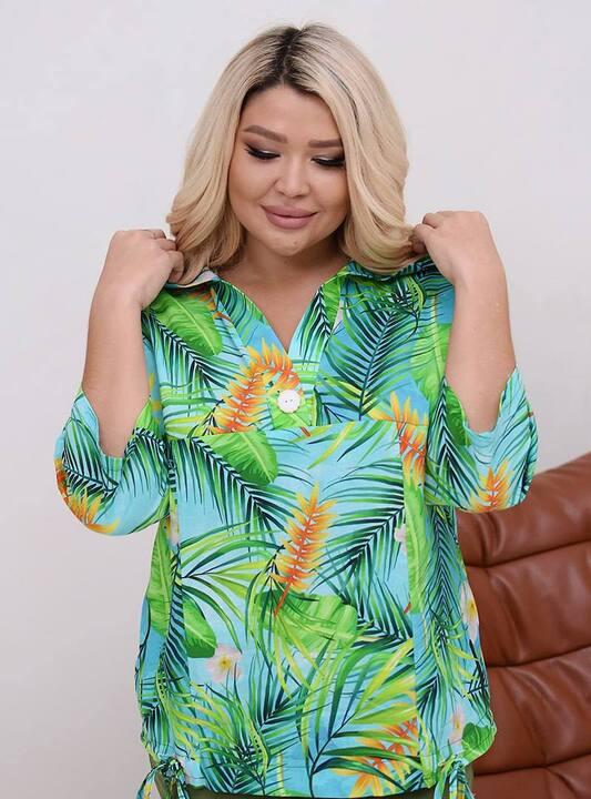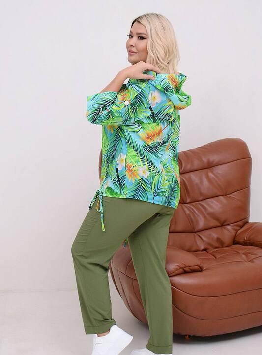 Верх комплекта привлекает внимание красивым растительным принтом, который делает образ более живым, заметным и стильным. Блуза свободного кроя мягко ложится по фигуре, не сковывает движения и позволяет чувствовать себя легко и непринужденно. Капюшон добавляет модели расслабленную современную ноту, а боковые кулиски в нижней части делают фасон более интересным и помогают красиво регулировать посадку. Благодаря этому верх выглядит не просто удобно, а действительно продуманно и актуально, с акцентом на детали, которые делают вещь выразительной.