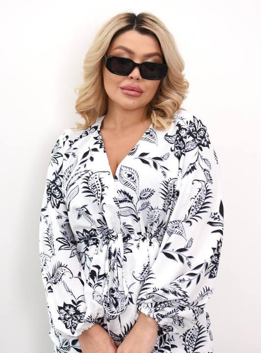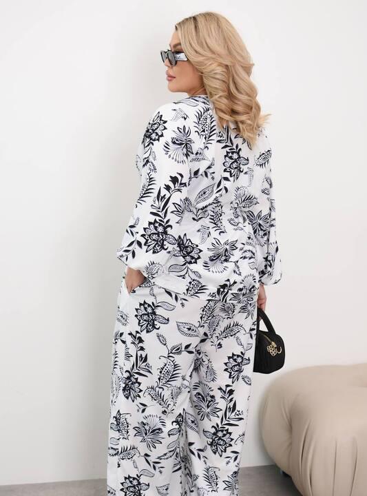 Ткань софт делает модель особенно комфортной в носке. Материал мягкий, приятный, красиво ложится по фигуре и подчеркивает легкость всего образа. Выразительный растительный принт оживляет комплект, делает его заметным и добавляет индивидуальности, не перегружая общий вид. Такой костюм отлично подойдет для прогулок, поездок, встреч, семейных мероприятий и красивых городских образов. Его можно дополнить обувью на каблуке для более изящного настроения или выбрать более спокойные сочетания для расслабленного, но эффектного выхода. Это стильный, женственный и очень удачный комплект, который легко становится одним из самых красивых в гардеробе.