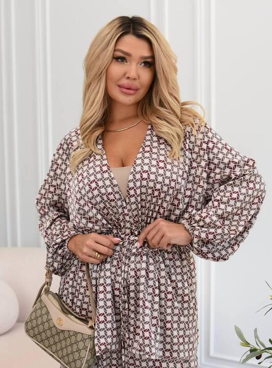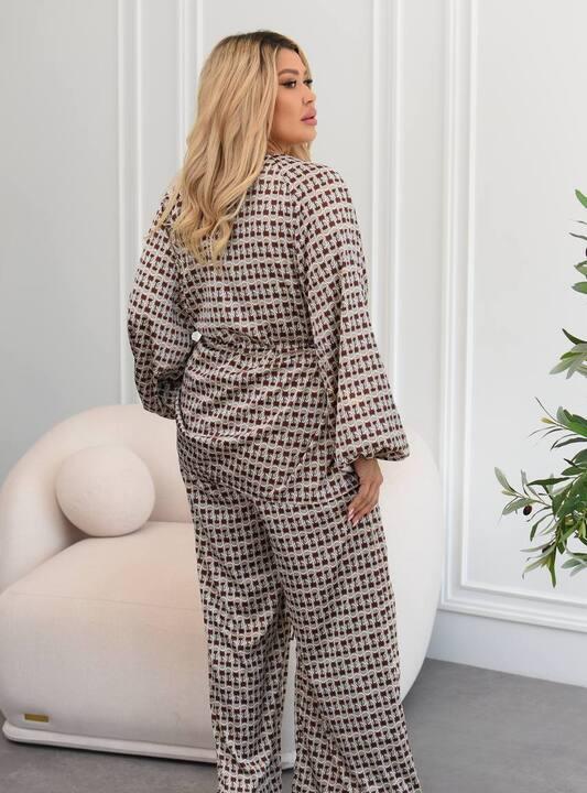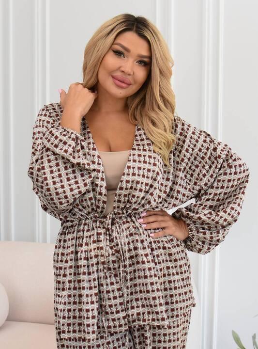 Модель состоит из свободной рубашки и широких брюк, благодаря чему силуэт получается вытянутым, плавным и визуально более изящным. Верх оформлен с глубоким запахом и дополнен поясом, который красиво подчеркивает линию талии и делает посадку более женственной. Длинные рукава добавляют образу элегантности, а мягкий ниспадающий крой создает ту самую легкость, за которую такие комплекты особенно ценят. Рубашку можно носить не только как часть комплекта, но и отдельно, сочетая с базовыми брюками, джинсами или юбками.