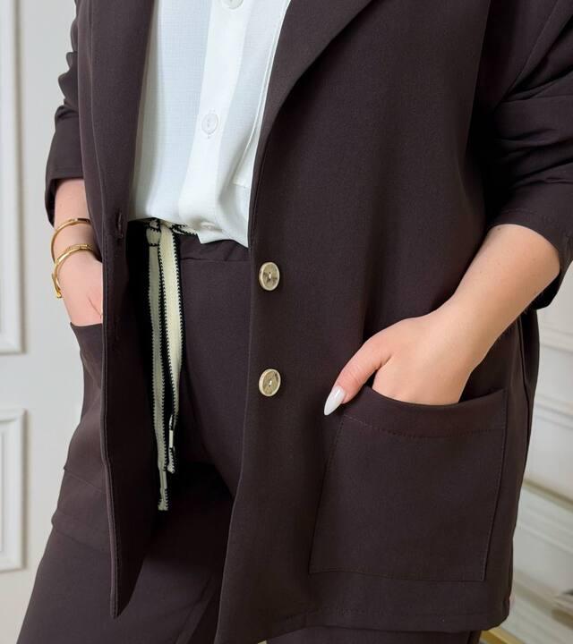 Такой костюм можно носить как единым комплектом, так и по отдельности. Жакет хорошо сочетается с джинсами, юбками и платьями, а брюки легко комбинируются с футболками, блузами, рубашками и лонгсливами. Благодаря этому комплект становится не просто красивой двойкой, а по-настоящему выгодным приобретением для гардероба. Это отличный выбор для женщин, которые хотят выглядеть современно, аккуратно и уверенно, не жертвуя комфортом и удобством в течение всего дня.