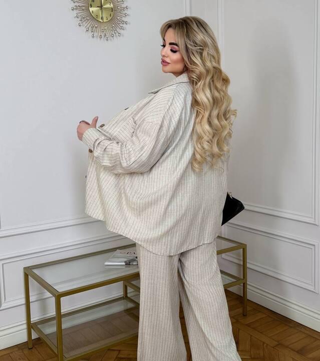 Вертикальная полоска делает модель еще более выразительной и визуально стройнит силуэт, что всегда особенно выигрышно смотрится в костюмных комплектах. Такой принт придает образу динамику, свежесть и делает костюм заметным без лишней перегруженности. Комплект можно носить как вместе, так и по отдельности, сочетая верх с джинсами, юбками или базовыми брюками, а брюки — с футболками, топами, рубашками и жакетами. Это практичная, удобная и действительно эффектная вещь, которая легко станет одной из самых любимых в гардеробе.