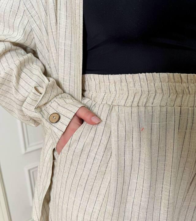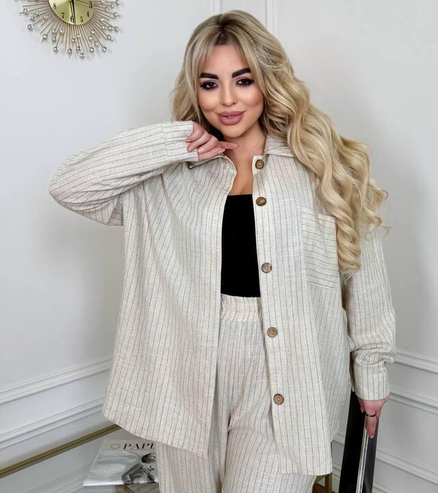 Костюм выполнен из льна, поэтому особенно ценится за комфорт в носке, приятные ощущения к телу и естественный, благородный внешний вид. Материал красиво ложится по фигуре, не утяжеляет силуэт и делает образ более дорогим и выразительным. Льняная фактура всегда выглядит актуально и придает изделию особый характер, благодаря которому комплект смотрится не просто практично, а действительно стильно. Такая ткань отлично подходит для повседневного гардероба, когда важны и удобство, и привлекательный внешний вид.