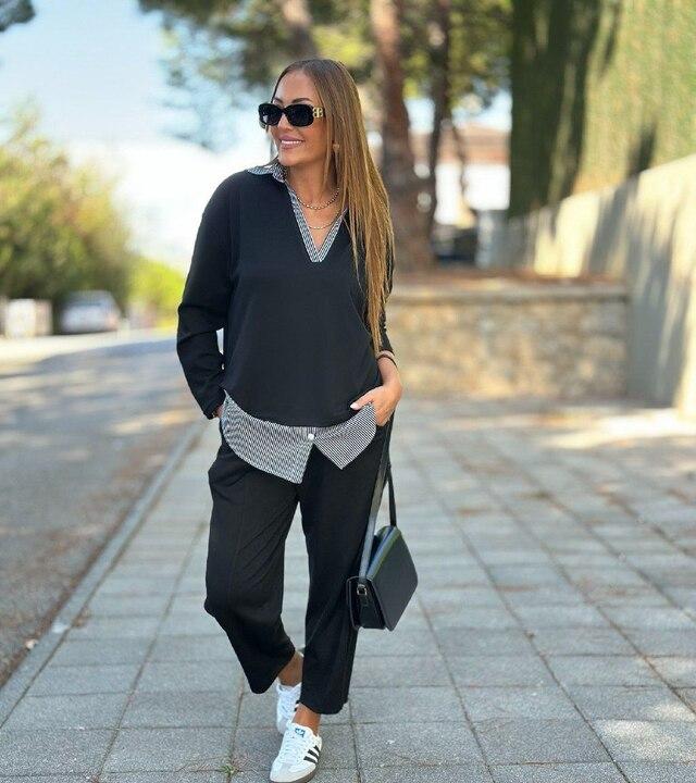 Верх выполнен в формате удлиненной туники свободного кроя, поэтому модель красиво садится, не облегает и помогает создать современный расслабленный силуэт. V-образный вырез делает образ более женственным и визуально вытягивает линию шеи, а контрастная отделка в рубашечном стиле по нижнему краю и в зоне выреза добавляет эффект многослойности и делает костюм более выразительным. Рукава удобной длины подчеркивают непринужденный характер модели и делают комплект особенно комфортным для ежедневной носки.