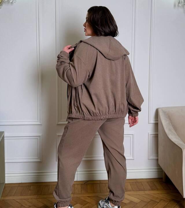 Верх выполнен в свободном крое и дополнен удобной застежкой-молнией, что делает модель практичной и удобной в носке. Капюшон добавляет комплекту современное спортивное настроение и усиливает ощущение уюта. Свободная посадка не сковывает движения и хорошо смотрится на разных типах фигуры. Манжеты на рукавах помогают сохранить аккуратный силуэт, а карманы делают кофту еще более удобной и функциональной в повседневном использовании.