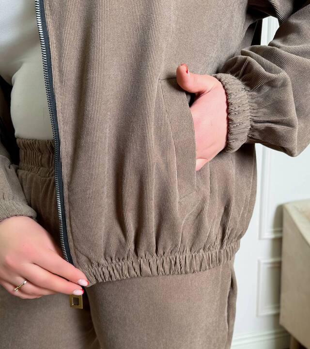 Модель выполнена из микровельвета, благодаря чему комплект выглядит особенно уютно и выразительно. Материал приятен в носке, имеет красивую фактуру и делает образ более интересным и стильным. Такая ткань хорошо подходит для повседневной одежды, потому что дарит ощущение комфорта, мягкости и визуальной собранности. Костюм не выглядит слишком простым, а наоборот, производит впечатление продуманной и актуальной вещи, которую приятно носить каждый день.