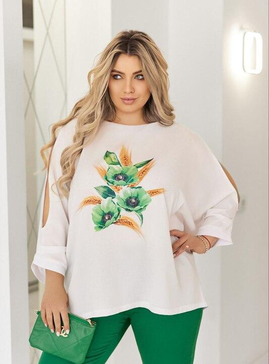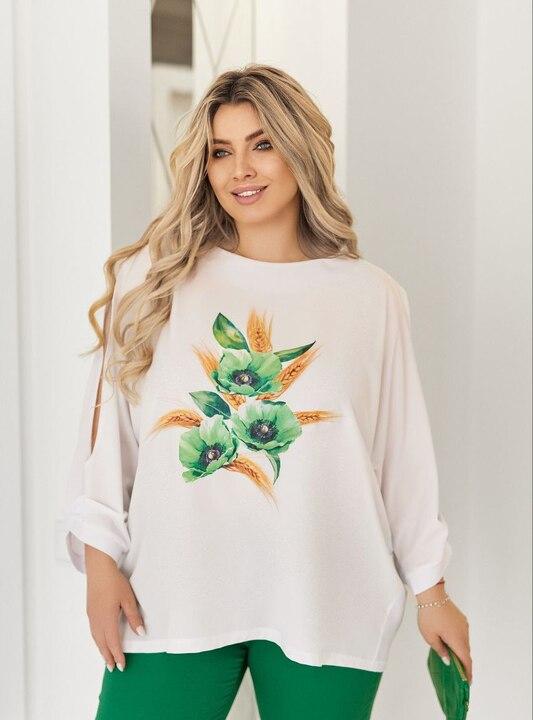 Блузка свободного кроя смотрится легко, мягко и выразительно. Акцентный принт на передней части делает модель заметной и добавляет образу индивидуальность, а эффектные разрезы на рукавах придают вещи более интересный и современный характер. Благодаря такому решению блузка выглядит не просто базовой, а действительно стильной и продуманной. Мягкая ткань приятно ощущается в носке, красиво ложится и дарит комфорт в течение дня. Свободный силуэт помогает чувствовать легкость в движении и делает комплект особенно удобным для повседневной носки.
