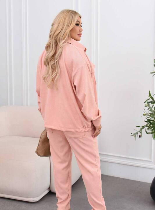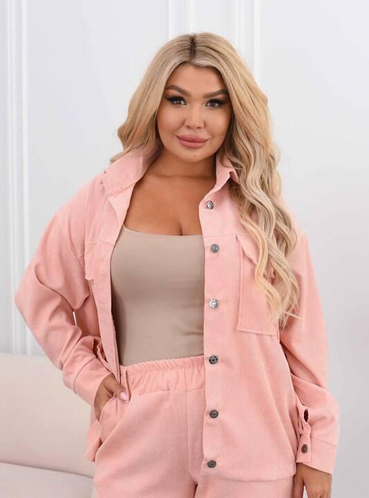Фактурный вельвет придаёт комплекту выразительность и делает образ более интересным без лишнего декора. Материал выглядит аккуратно, держит форму и создаёт приятное ощущение уюта. Верх дополнен классическим воротником, застёжкой на пуговицы и накладными карманами, благодаря чему костюм выглядит завершённо и продуманно. Рукава оформлены аккуратно, а свободный силуэт позволяет носить верх как в застёгнутом виде, так и нараспашку поверх майки, топа или базового боди.