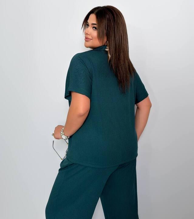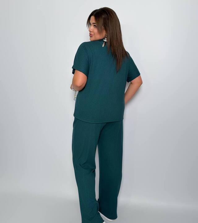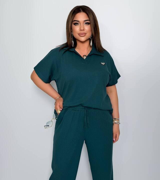 Верх выполнен в формате свободной футболки-поло с мягкой линией воротника и коротким рукавом. Такой фасон делает образ более собранным и интересным, чем обычная базовая футболка, но при этом сохраняет ощущение легкости и непринужденности. Свободная посадка красиво ложится по фигуре, не сковывает движения и помогает чувствовать себя комфортно в течение всего дня. Фактурный рубчик делает модель визуально более выразительной и придает комплекту аккуратный, стильный и дорогой вид без лишней перегруженности деталями.