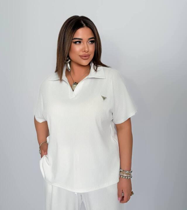 Верх выполнен в формате свободной футболки с аккуратным отложным воротником и коротким рукавом. За счет такого фасона модель выглядит более собранно и интересно, чем классическая базовая футболка, но при этом остается такой же удобной и универсальной. Свободная посадка не сковывает движения, красиво ложится по фигуре и помогает чувствовать себя комфортно в течение всего дня. Лаконичный дизайн делает верх легким для сочетания с разной обувью, аксессуарами и верхней одеждой, а сам комплект приобретает стильный и современный характер.