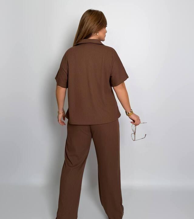 Верх выполнен в формате свободной футболки-поло с мягкой линией воротника и коротким рукавом. Такой фасон делает образ более собранным и интересным, чем обычная базовая футболка, но при этом сохраняет ощущение легкости и непринужденности. Свободная посадка не сковывает движения, красиво ложится по фигуре и помогает чувствовать себя комфортно в течение всего дня. Фактурный рубчик делает модель визуально более выразительной и придает комплекту аккуратный, стильный и дорогой вид без лишней перегруженности деталями.