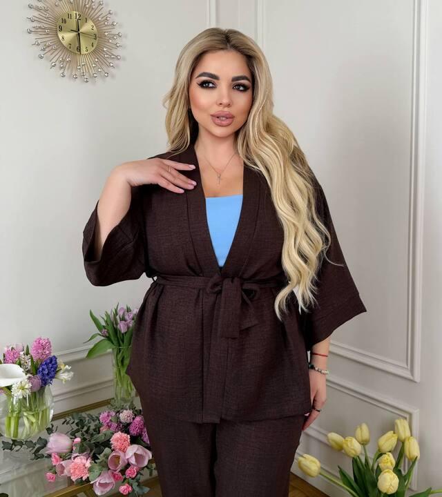 Лен «Бохо» придает костюму выразительную фактуру и благородный внешний вид. Материал смотрится натурально, стильно и всегда уместно в базовом гардеробе. Такой комплект легко сочетать с майками, топами, футболками, обувью на низком ходу, мюлями, босоножками или лаконичными туфлями. Это отличный вариант для прогулок, неформальных встреч, поездок, отдыха и повседневных дел, когда особенно важно выглядеть красиво, чувствовать свободу движений и получать удовольствие от каждой детали образа.
