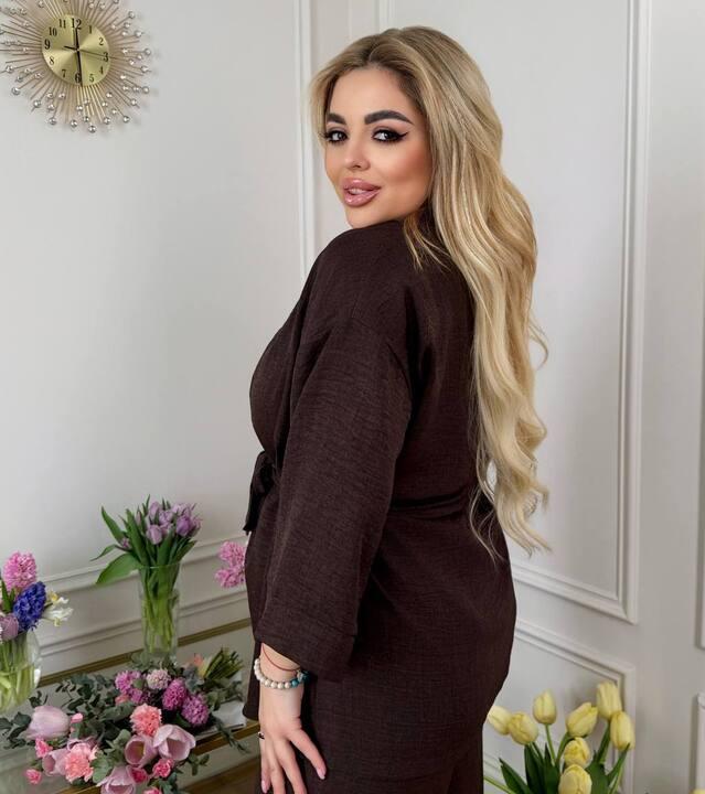 Женский костюм-двойка из льна «Бохо» — это удачное сочетание легкости, комфорта и современного повседневного стиля, который выглядит дорого, спокойно и очень уверенно. Такой комплект прекрасно подходит для женщин, которые хотят получить готовый образ без лишних сложностей: достаточно добавить базовый топ, любимую обувь и несколько аксессуаров, чтобы выглядеть собранно, женственно и актуально. Костюм смотрится расслабленно, но при этом не теряет аккуратности, поэтому легко вписывается в повседневный гардероб и быстро становится одной из самых востребованных вещей сезона.