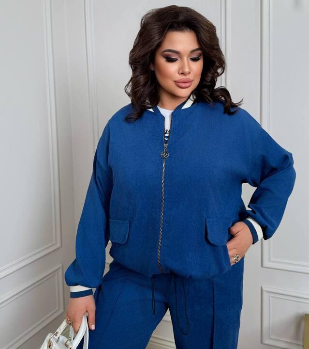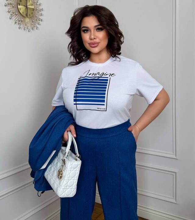 Бомбер имеет свободную посадку, благодаря чему образ выглядит современно и непринужденно. Широкие брюки делают силуэт более вытянутым и визуально стройным, а внутренняя футболка завершает комплект и делает его максимально удобным. Такой костюм отлично подходит для прогулок, поездок, повседневных выходов, встреч и активного ритма жизни. Это удачный выбор для женщин, которым нужна комфортная, носибельная и при этом эффектная тройка, способная подчеркнуть хороший вкус, любовь к удобству и актуальному стилю.