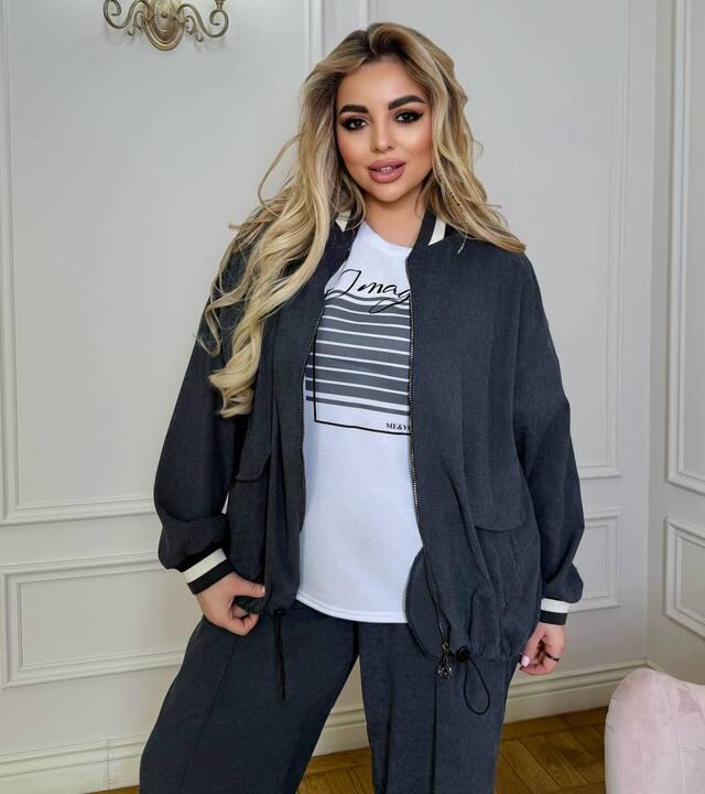 Женский костюм-тройка — это удобный, современный и очень практичный комплект, который помогает без лишних усилий создать цельный, стильный и продуманный образ на каждый день. Модель смотрится актуально, уверенно и гармонично: свободный бомбер делает силуэт более расслабленным и модным, базовая футболка добавляет образу легкость и универсальность, а широкие брюки красиво вытягивают фигуру и делают комплект особенно выразительным. Такой вариант отлично подойдет для женщин, которые ценят комфорт, но при этом хотят выглядеть собранно, современно и действительно стильно.