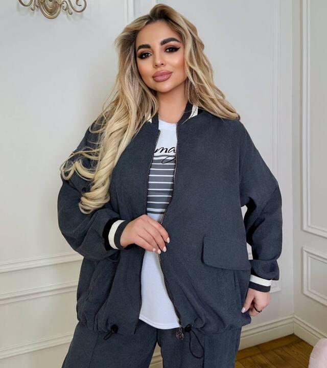 Бомбер имеет свободную посадку, благодаря чему образ выглядит современно и непринужденно. Широкие брюки делают силуэт более вытянутым и визуально стройным, а внутренняя футболка завершает комплект и делает его максимально удобным. Такой костюм отлично подходит для прогулок, поездок, повседневных выходов, встреч и активного ритма жизни. Это удачный выбор для женщин, которым нужна комфортная, носибельная и при этом эффектная тройка, способная подчеркнуть хороший вкус, любовь к удобству и актуальному стилю.