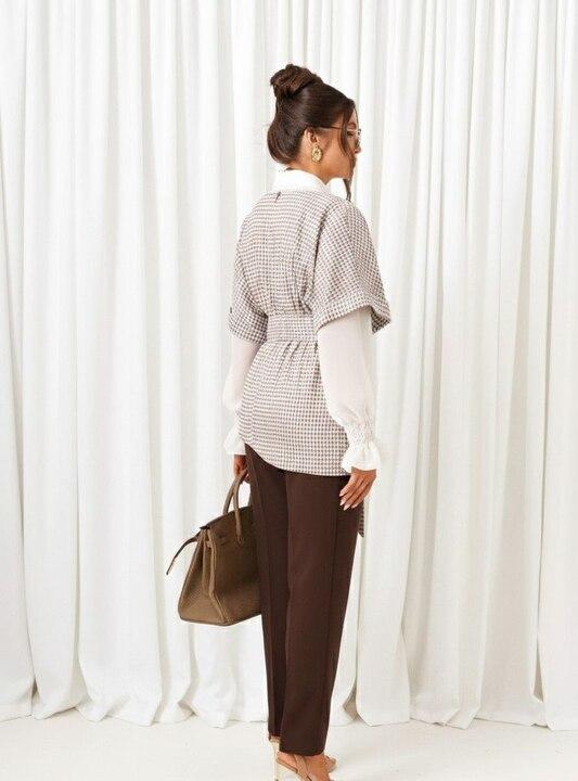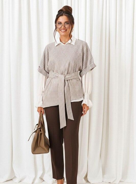 Комплект состоит из жилета, блузы и брюк, благодаря чему открывает много вариантов стилизации. Его можно носить полным набором, создавая цельный и завершенный образ, а можно легко комбинировать каждый элемент отдельно с другими вещами гардероба. Жилет придает комплекту структуру и делает силуэт более выразительным, блуза добавляет легкости и женственности, а брюки визуально вытягивают образ и помогают сохранить аккуратную, уверенную посадку. За счет такого сочетания костюм выглядит продуманно и очень удобно адаптируется под разные ситуации.