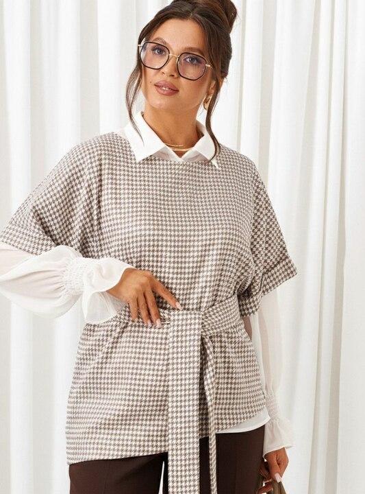 Ткань брюк хорошо держит форму, смотрится аккуратно и помогает образу сохранять опрятный вид в течение дня. Верхняя часть комплекта добавляет фактурности и делает костюм более интересным визуально, за счет чего модель выглядит не скучно, а действительно стильно и запоминающе. Пояс выгодно подчеркивает линию талии и помогает красиво оформить силуэт, делая посадку более собранной и женственной.