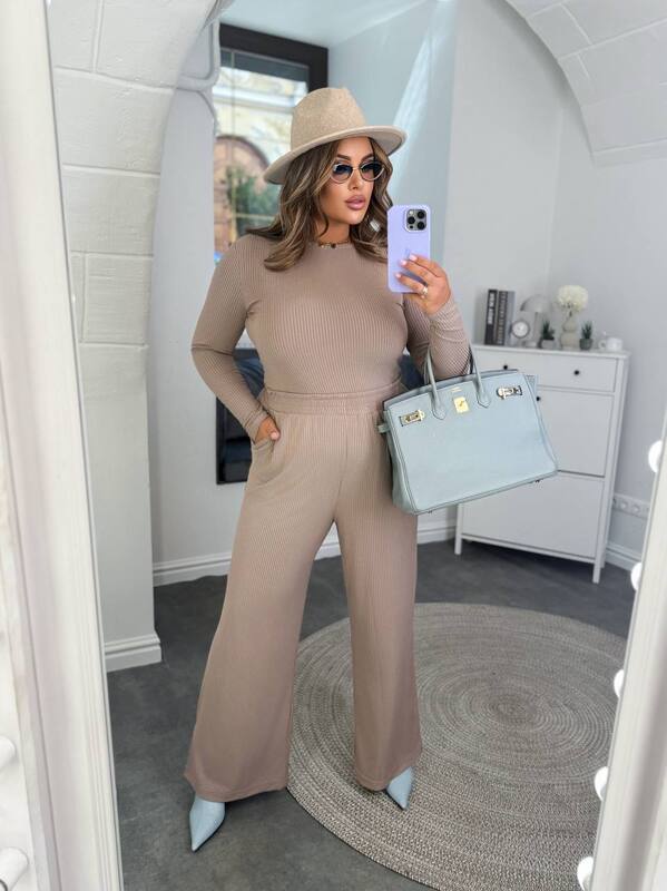 Элегантный женский костюм из трикотажа рубчик станет идеальным выбором для осеннего сезона. Комплект включает лонгслив с длинным рукавом и аккуратным круглым вырезом и широкие брюки с комфортной посадкой. Благодаря мягкой и эластичной ткани костюм отлично садится по фигуре, подчеркивает линии силуэта и при этом обеспечивает свободу движений.
