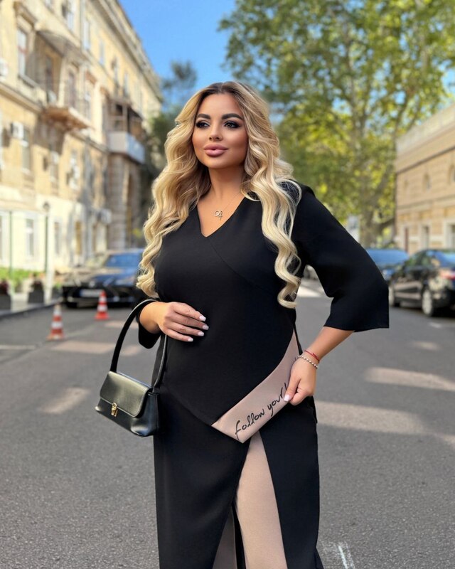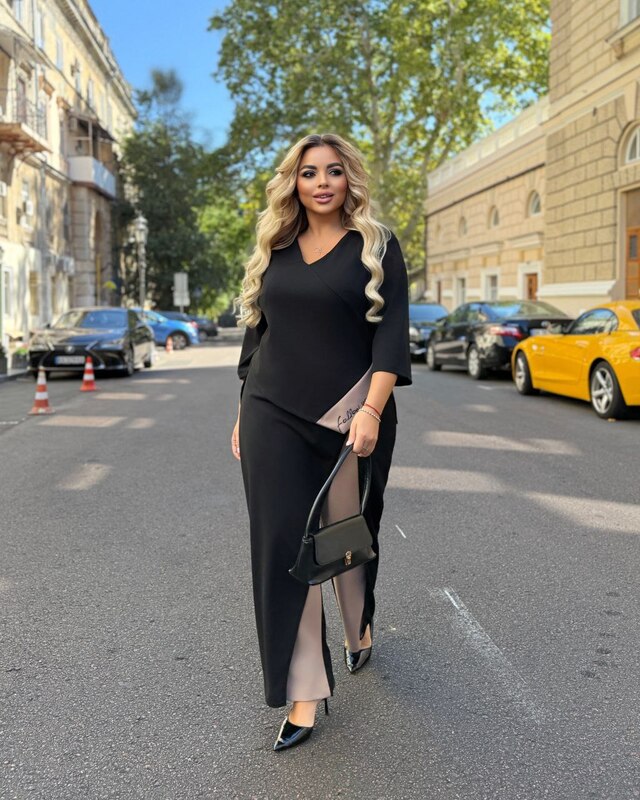 Комплект включает в себя блузу и брюки. Блуза выполнена с имитацией запаха, что визуально стройнит и акцентирует внимание на линии талии. Асимметричный низ добавляет динамики и оригинальности, делая образ более выразительным. Яркая декоративная планка внизу служит стильным акцентом, освежает общий вид и подчеркивает индивидуальность. Брюки прямого кроя создают легкий и изящный силуэт, их длина и свободный фасон позволяют носить костюм с различной обувью — от классических лодочек до ботильонов.