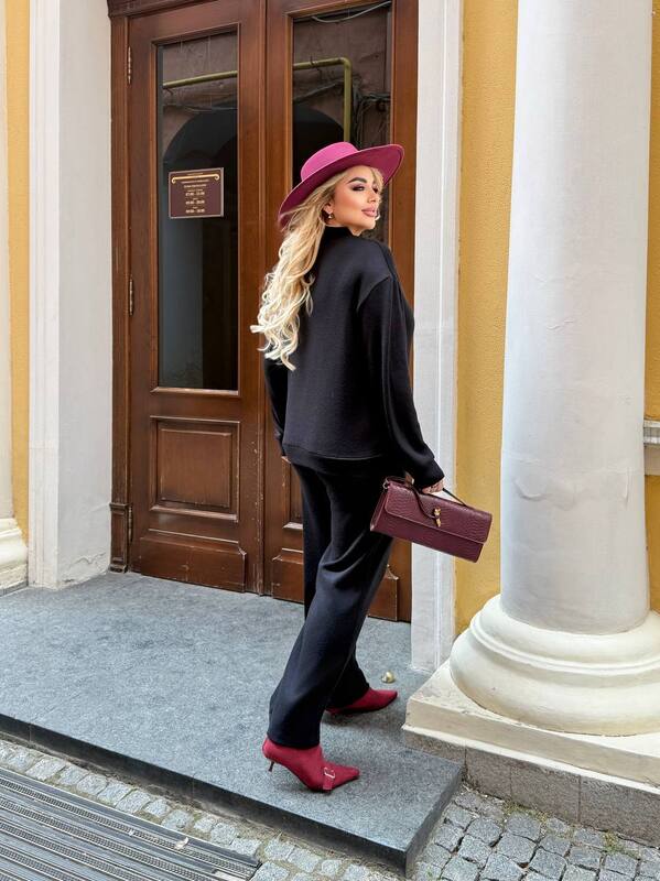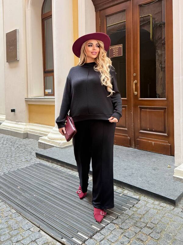 Комплект состоит из свободного свитера и брюк прямого кроя. Свитер имеет лаконичный дизайн с мягкой линией плеч, что придаёт силуэту лёгкость и современный вид. Брюки выполнены с комфортной посадкой на талии, благодаря эластичной резинке, и прямыми штанинами, которые визуально вытягивают фигуру. Свободный крой обеспечивает комфорт и свободу движений, а аккуратные швы и продуманный силуэт создают изысканный образ.