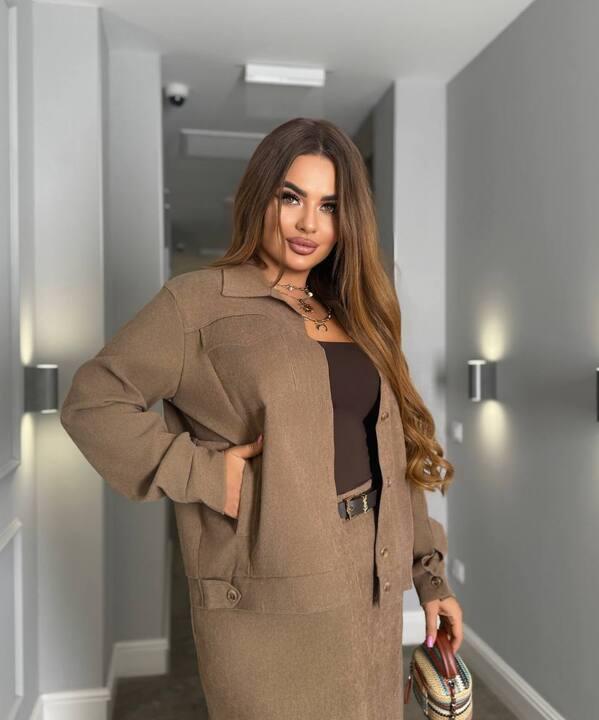Бомбер делает образ более интересным и универсальным. Он удобно садится, не перегружает силуэт и при этом отлично дополняет юбку, создавая цельный комплект с продуманным характером. Юбка-карандаш визуально вытягивает фигуру, подчеркивает женственные линии и добавляет образу аккуратности. Разрез спереди делает модель не только более эффектной внешне, но и более удобной в носке, обеспечивая комфорт при ходьбе. За счет такого сочетания костюм выглядит очень выигрышно и подходит женщинам, которые ценят баланс между красотой, практичностью и современной подачей.