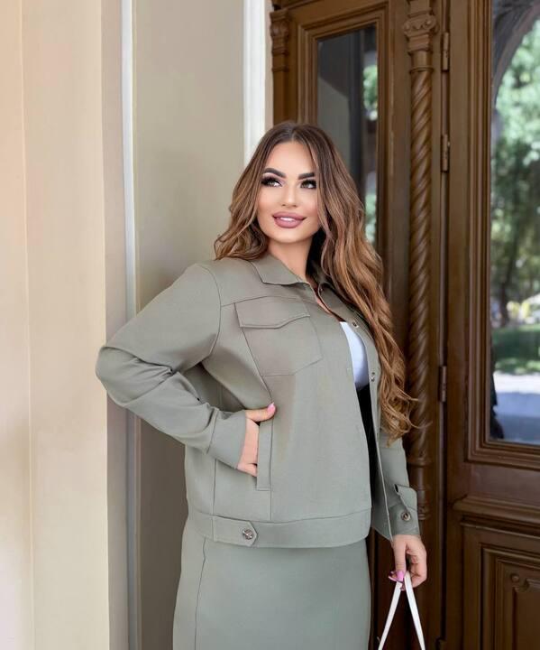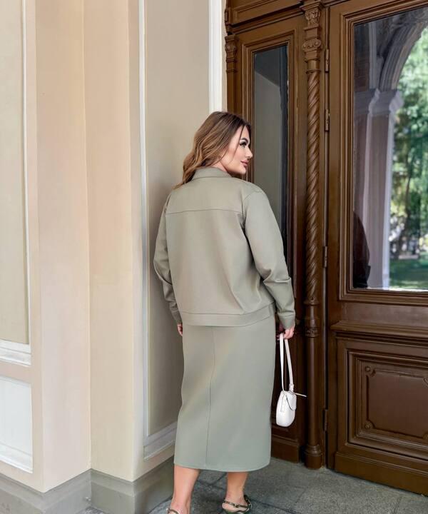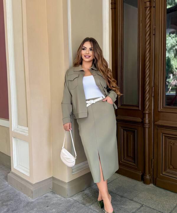 Юбка-карандаш красиво подчёркивает силуэт, делает фигуру более собранной и визуально вытягивает образ. Разрез спереди добавляет удобства при ходьбе и делает посадку более комфортной на каждый день. За счёт этого костюм выглядит женственно, но не перегружено, а весь образ получается стильным, уверенным и очень актуальным. Такой комплект подойдёт женщинам, которые любят вещи с хорошей посадкой и хотят выглядеть аккуратно без лишней строгости.