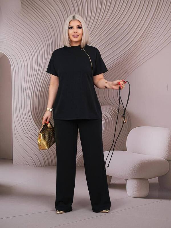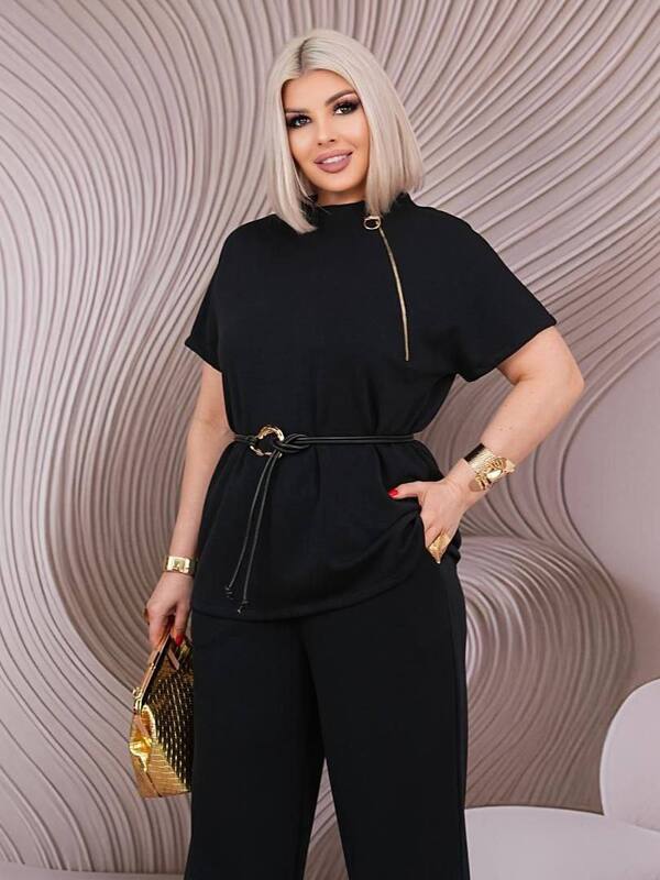 Верх комплекта выполнен в свободном фасоне, благодаря чему посадка получается комфортной и современной. Декоративная рабочая молния делает модель более выразительной, добавляет интересный акцент и подчеркивает актуальность дизайна. Пояс красиво выделяет талию и помогает сделать силуэт более собранным и женственным, поэтому комплект выглядит не просто удобно, а действительно эффектно. Такой верх можно носить как с поясом для более подчеркнутой посадки, так и более расслабленно, меняя настроение образа.