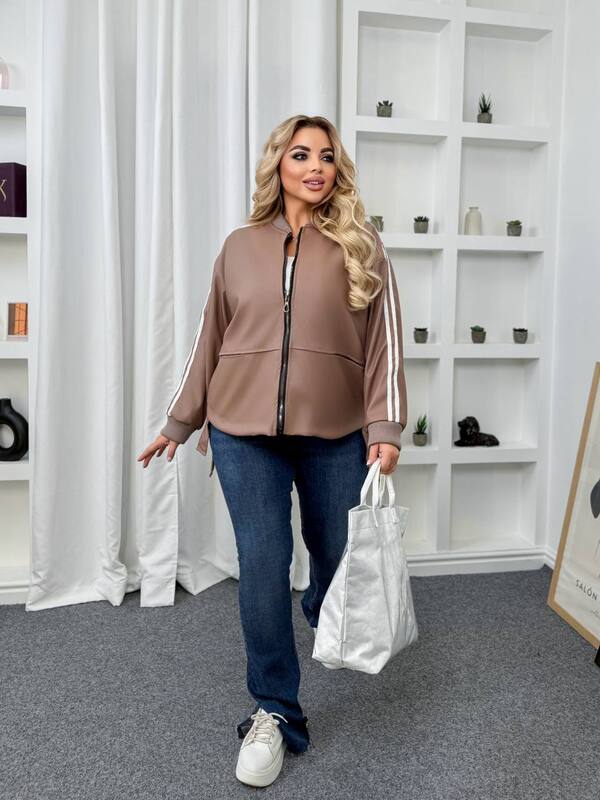 Модель выполнена в современном стиле с элементами спортивного кэжуала. Свободный оверсайз-крой обеспечивает удобную посадку и комфорт в движении. Центральная застёжка-молния оформлена контрастной отделкой, добавляя динамичности. Манжеты на рукавах и воротнике выполнены из плотной резинки, обеспечивающей комфортное прилегание и защиту от ветра. По линии рукавов проходят контрастные полосы, придающие модели модный и свежий акцент. Куртка дополнена боковыми карманами и удлинённой спинкой с лёгкими боковыми разрезами.