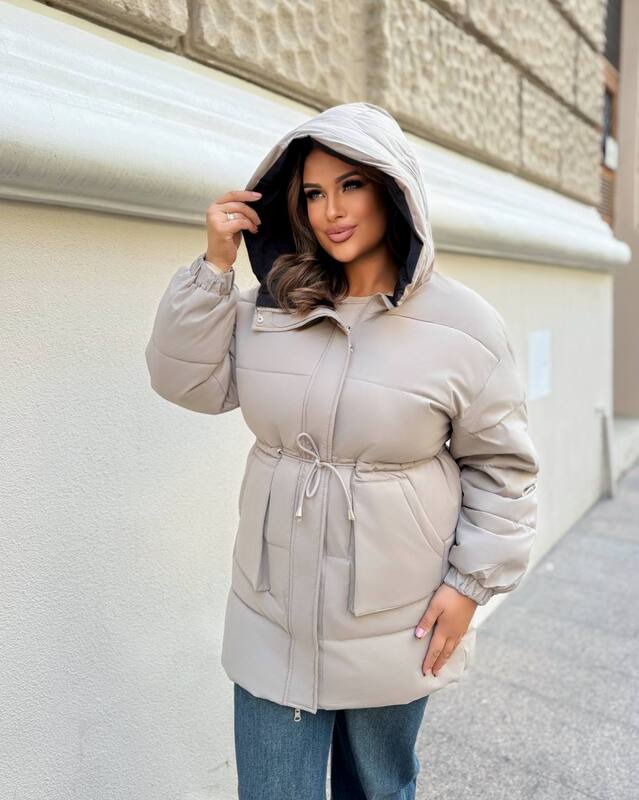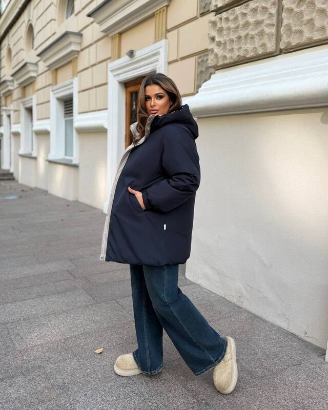 Высокий воротник и объемный капюшон делают куртку еще более практичной для холодных и снежных дней. Удлиненная длина по спинке (81–85 см) защищает от холода и сохраняет тепло, делая модель удобной для прогулок и активного образа жизни. Элегантное сочетание темно-синего и бежевого оттенков позволяет легко комбинировать куртку с разными элементами гардероба — от джинсов до женственных платьев. Такая модель станет универсальным решением для зимы, совмещающим стиль и практичность.