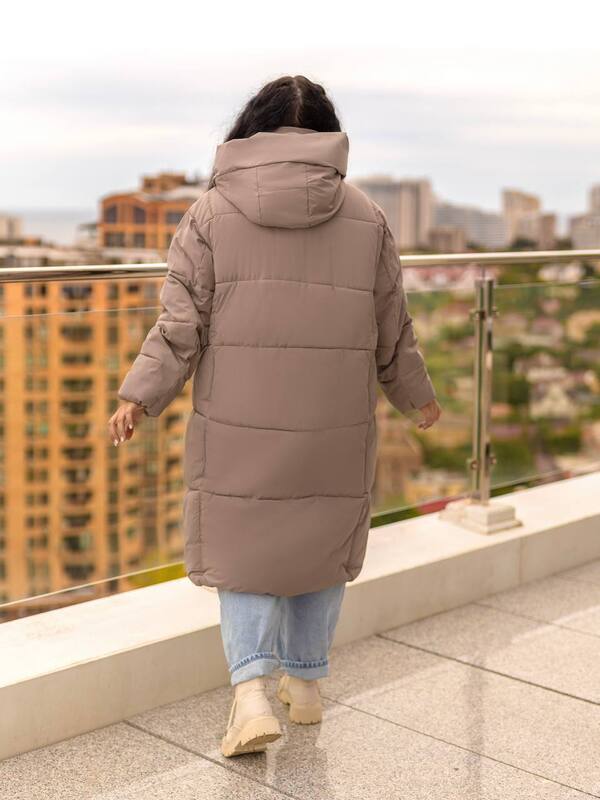 Куртка имеет удлиненный фасон длиной по спинке 109–114 см, что обеспечивает надежную защиту даже в сильные морозы. Прямой силуэт и оверсайз-посадка позволяют носить её с любыми образами, в том числе поверх объемных свитеров. Высокий воротник надежно прикрывает шею от ветра, а съемный капюшон добавляет универсальности — при желании его можно снять.