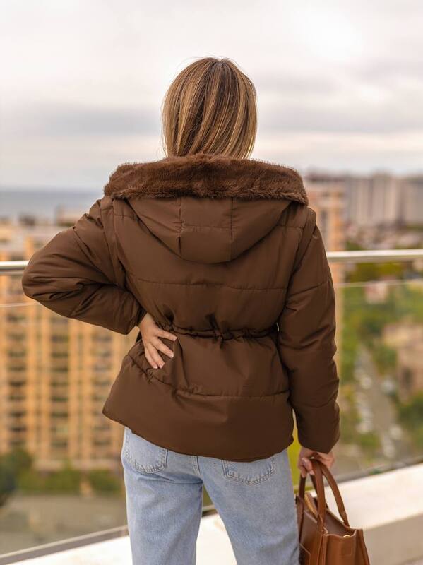 Капюшон украшен искусственным мехом «под норку», добавляющим изысканности и уюта образу. Кулиска на талии помогает подчеркнуть фигуру и скорректировать посадку по желанию, а вместительные карманы делают изделие практичным для повседневного использования.