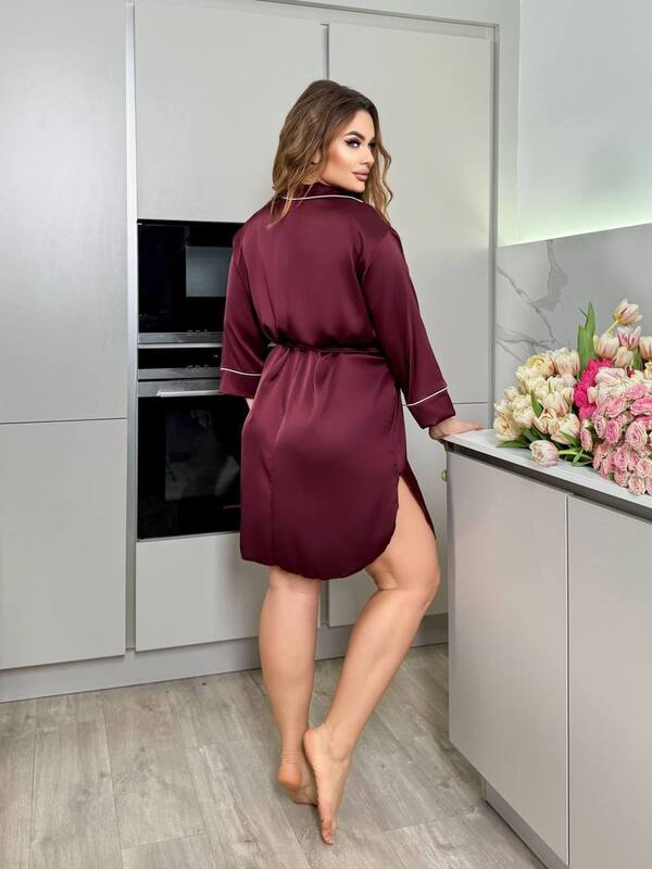 Халат имеет длину чуть выше колена и небольшой разрез сбоку, благодаря чему образ выглядит женственно и соблазнительно. Свободный крой обеспечивает комфорт и лёгкость движений, а аккуратная окантовка по краям подчёркивает премиальное качество изделия.