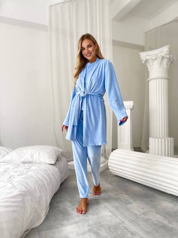 Женский домашний комплект-тройка выполнен из мягкого трикотажного велюра, который отличается приятной текстурой, легким блеском и особым комфортом. Ткань теплая и нежная на ощупь, идеально подходит для осеннего сезона, обеспечивая уют и элегантный вид в домашней обстановке. Велюр долговечен и сохраняет форму после стирок, что делает костюм практичным и стильным выбором. Такой комплект создан для женщин, которые ценят сочетание уюта и изысканности в повседневной одежде.