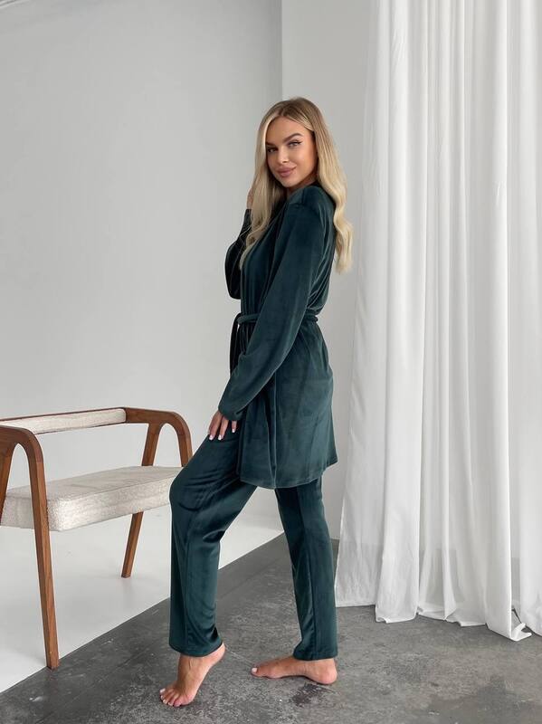 Отзывы о Домашний комплект-тройка женский из трикотажного велюра кофта с поясом брюки и накидка осенний k-123797