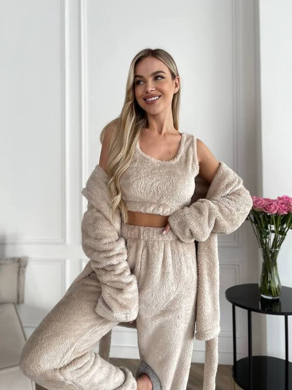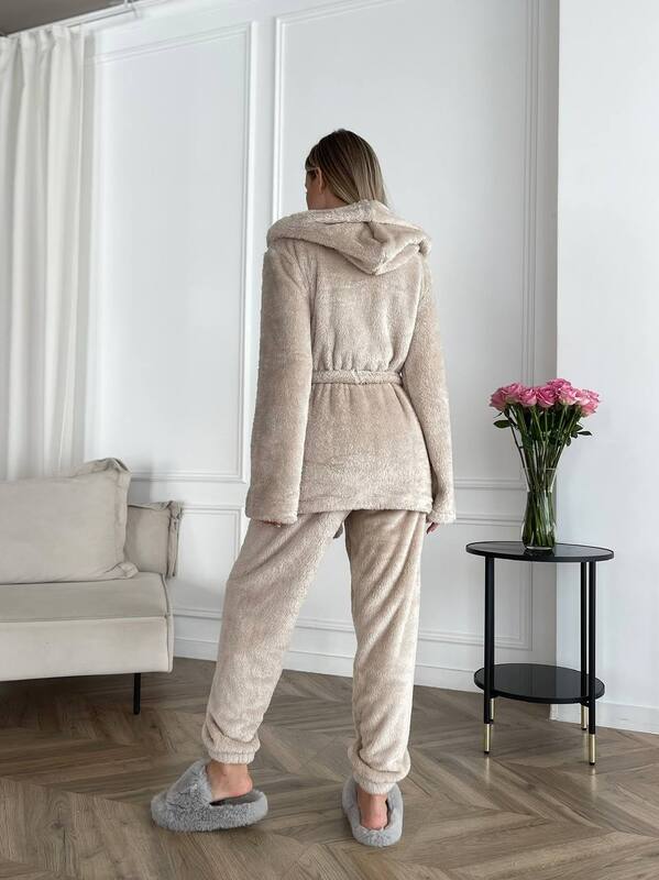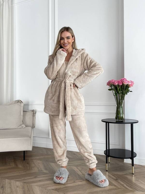 Комплект состоит из трёх элементов: халата с капюшоном и поясом, комфортных брюк с манжетами и базовой майки. Халат свободного кроя обеспечивает комфорт движений и красиво подчеркивает фигуру, пояс позволяет регулировать посадку по талии. Брюки с мягкой резинкой и манжетами не сползают и удерживают тепло, обеспечивая максимальное удобство при носке. Вся конструкция продумана для идеального сочетания практичности и домашнего очарования.