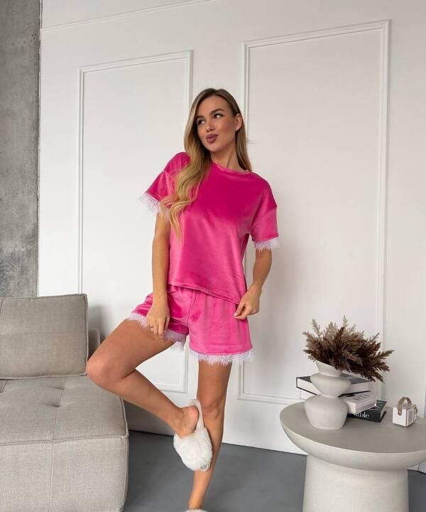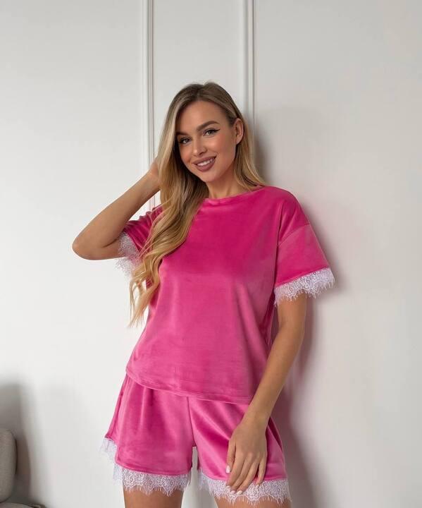 Пижама женская велюровая домашняя с футболкой и шортами с кружевом демисезонная k-128024
