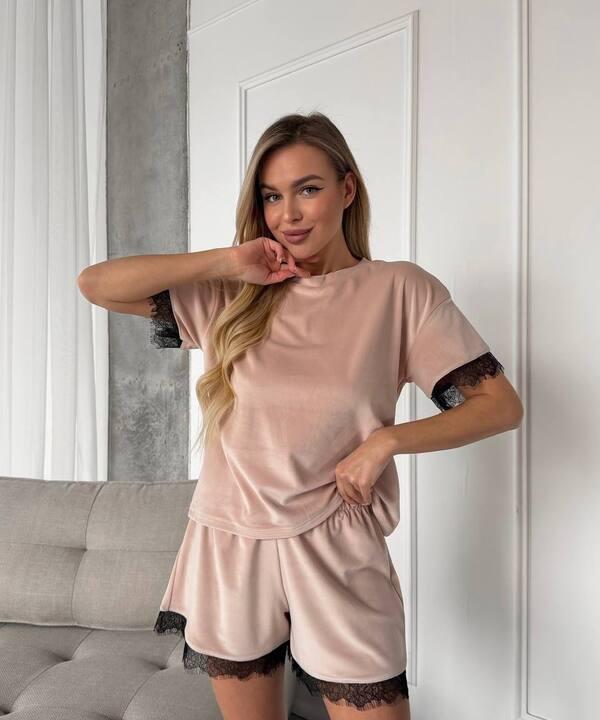 Отзывы о Пижама женская велюровая домашняя шорты и футболка с коротким рукавом и кружевной отделкой демисезонная k-128025